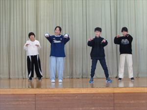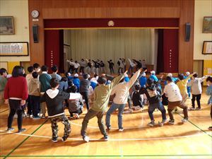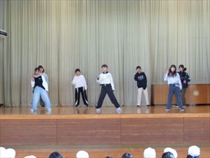 まずは、今日の中間休みに行われたダンスクラブの発表から。これまでのクラブ活動の時間に練習してきた成果の発表です。中間休みになると、体育館へ子どもたちが次々と集まってきました。たくさんの観衆の前で、ダンスクラブのパフォーマンスが始まりました。
