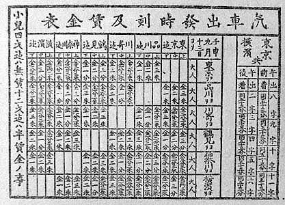 鉄道の開通が契機となって、翌明治6年1月1日に今日の24時間制が導入された。まさに生活時間の革命である。ちなみに上の写真は明治5年東京(新橋)から横浜開業時の時刻表及び賃金表である。右の出発時間の欄に「刻」との混乱を避けるため、「時」ではなく、「字」の文字が使用されている。
