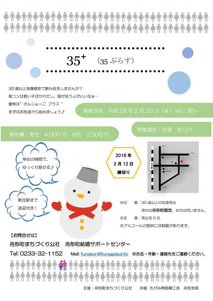 こんばんは?舟形町結婚サポートセンターです大寒を過ぎましたが、まだまだ寒さが厳しい町内ですが皆様体調など崩されていませんか?町内外の小中学校ではインフルエンザが流行り始め、休校の学校も出てきているようです…皆様も油断せずお身体お自愛くださいねさて本日は結婚サポートセンター主催のイベントのご紹介です!!『35+(35ぷらす)』同じ年代の人と楽しく気軽に出会えるようなそんな機会が欲しい…そんな意見から35+は生まれました。会話を楽しみながら、まずはお友達から始めませんか?日時:平成28年2月20日(土)16:30〜場所:舟形町 町家き乃川対象:35歳以上の独身の男女 ※男性は舟形町限定参加費:男性4,000円 女性2,500円開始も早めの時間帯なのでゆっくり会話を楽しめますよさらに新庄駅までの送迎付き!!連絡先の交換やマッチングは行わないので、個人情報が洩れる心配もありません。気になる方がいらっしゃいましたらスタッフまでお声がけください。その他詳細はお気軽にお問合せ下さい↓↓↓【お問合せ】舟形町結婚サポートセンターTEL : 0233-32-1152 FAX : 0233-32-1153Mail : funakon@funagata.info※氏名・年齢・連絡先をご連絡ください。