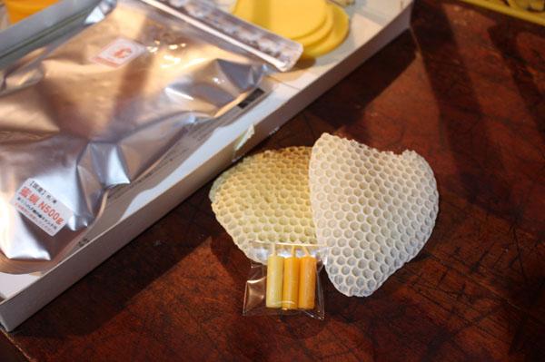 「自由研究にしたいから」と、注文をいだくと、大抵はこんなセットをサービスしています。ミツバチの巣と三色ミニキャンドル。ミツバチの巣に糸をはさんだだけで即席キャンドルが作れることや、蜜源植物によって蜜ろうの色も違いがあることを知ってもらえたら幸いです!