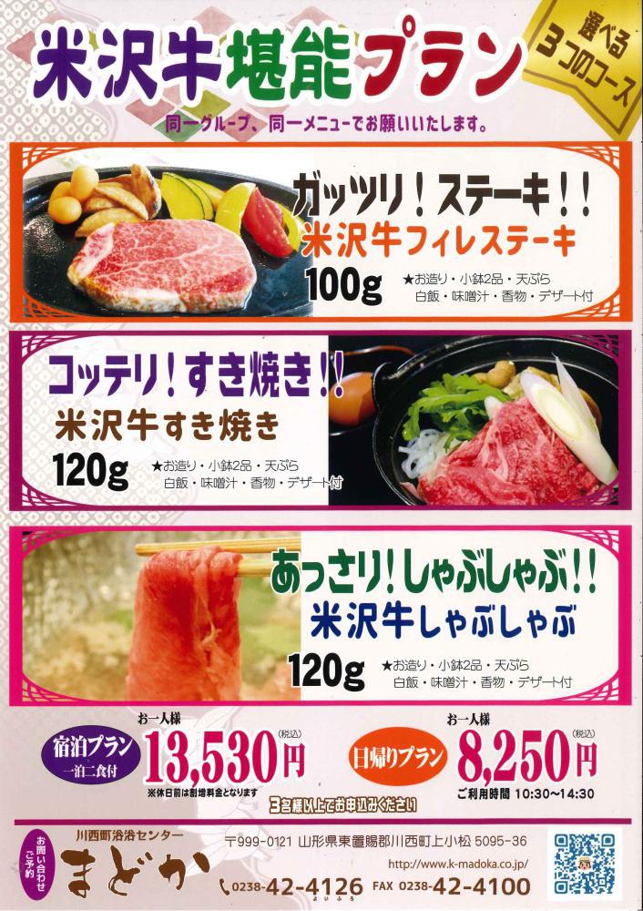 まどか豪華宿泊プラン12月〜 お一人様15000円税込(1泊2食付)の新たなプランが出来ました!!Gotoトラベルで今なら35%引きで約9,750円でご利用できます。※その他15%分の地域クーポン券がつきます。(飲み物代・お土産代等にご利用できます/// 宿泊人数の合計となります)※地域クーポンは、宿泊した当日と翌日までの期限となっております。お品書き選べる米沢牛料理 ステーキorすき焼きorしゃぶしゃぶの中から1種類鯛とロブスターのグリル、お寿司その他5品※女性の方限定で豪華なデザート付き※休前日は割増料金となります。※3名様以上〜の料金となります(人数によって変わります)※宴会場ご利用の場合別途お席料としてお一人様300円込み頂きます。※Gotoトラベルはこのプラン以外にも、まどかでは、1泊2食付11,330円税込のコースからご利用できます。(35%引きで約7,365円・地域クーポン券15%分も付きます・・・宿泊人数の合計となります)※少人数で気の合う仲間、ご家族、ご兄弟で泊まってみませんか?※お席はソーシャルディスタンスで配席して、安心安全でご利用いただけるよう感染症対策をしてお待ちいたしております。