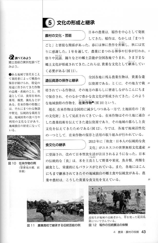 宮城県石巻北高等学校元校長の佐々木壽先生は在来ダイコンの研究者であり、「東北ダイコン風土誌」(東北出版企画)や「ダイコンの絵本」(農文協)の著者でもあり、宮城県の農業高校で長年にわたり地ダイコンを使って見事な教育活動を実践してこられた先生でもある。 佐々木先生は山形在来作物研究会の初期のころから会員になってくださっているのだが、全国の農業高校で使われている教科書「農業と環境」(実教出版、2013(平成25)年発刊)に、なんと「在来作物」のことを書いてくださり、現行の教科書(写真)にもその記述が採用されているよと教えてくださった。 ネットで現行の教科書を購入してみると、確かに「在来作物」があり、側注には在来作物の定義として、世代を超えて栽培者により種苗の保存と利用がつづけられてきた作物の品種・系統と書いてあった。教科書には引用をしめしていないが、佐々木先生は山形在来作物研究会の定義を参考にしてくださったとのこと。研究会の活動のなかでも、これは歴史的な出来事の一つだ。 山形在来作物研究会の活動がほんの少しでも、全国の農業高校の生徒さんの役に立ち、また地元の在来作物に目を向け、その価値を育てて継承してくれるきっかけになってくれているなら、こんなうれしいことはない。 執筆いただいた佐々木壽先生には感謝したい。