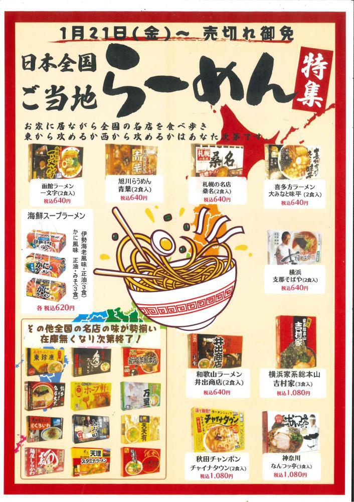 1月21日(金)〜北海道フェアにつづき第2弾売店では、日本全国ご当地らーめん特集開催お家に居ながら全国の名店食べ歩き♪名店の味が勢ぞろい。在庫無くなり次第終了です。ぜひ、この機会にお試し下さい♪