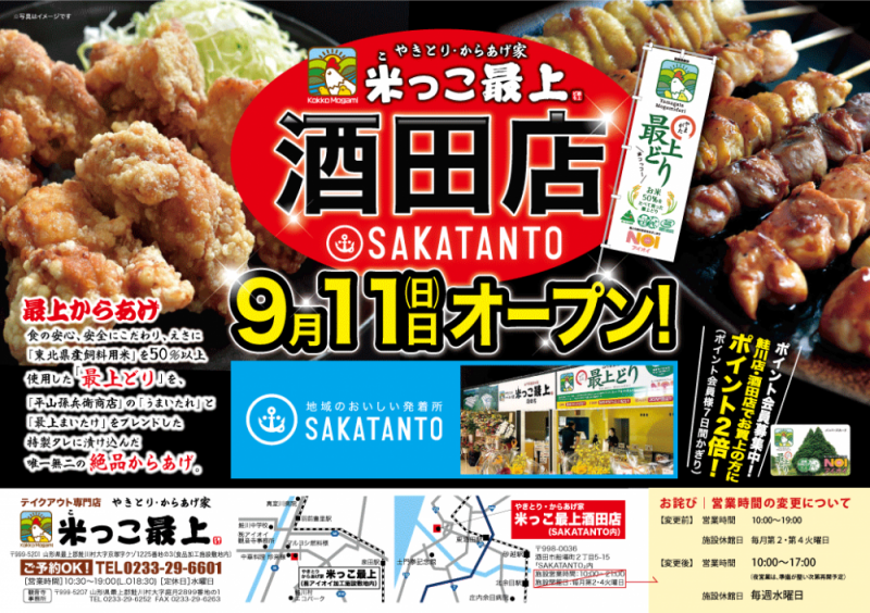 米っこ最上・酒田店東ふ頭交流施設みなとオアシス酒田SAKATANTに9/11(日)オープン!※最上どりの絶品からあげ&焼き鳥など オススメです!※皆様方のご来店を 心よりお待ちしております。▼米っこ最上・酒田店オープンご案内チラシ→ こちら[PDF]▼みなとオアシス酒田の概要 → こちら[PDF]