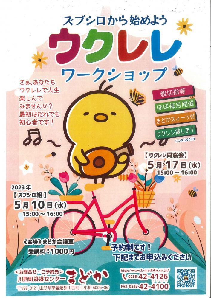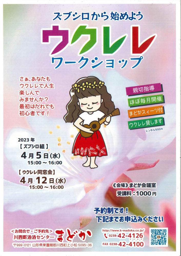 まどかDEウクレレ4月日程です。4/12(水)ウクレレ同窓会組15:00〜16:00 受講料1,000円(まどか特製スイーツ・ドリンク付)