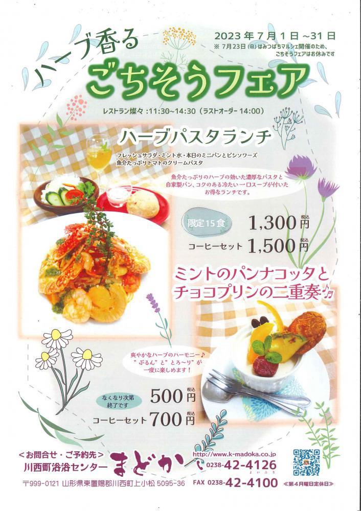 2023年7月1日〜31日レストラン燦燦:11:30〜14:30(14:00ラストオーダー)ハーブ香る”ごちそうフェア”開催まどかレストラン燦燦では期間中ハーブパスタランチを提供します!!●ハーブパスタランチ・・・1,300円  ※コーヒーセット・・・1,500円(フレッシュサラダ・ミント水・本日のミニパンとビシソワーズ魚介たっぷりのトマトクリームパスタ) 〜限定15食〜●ミントのパンナコッタとチョコプリンの二重奏・・・500円 ※コーヒーセット・・・700円〜無くなり次第終了〜 ★7月23日(日)は みつばちマルシェ開催の為ごちそうフェアはお休みです!!