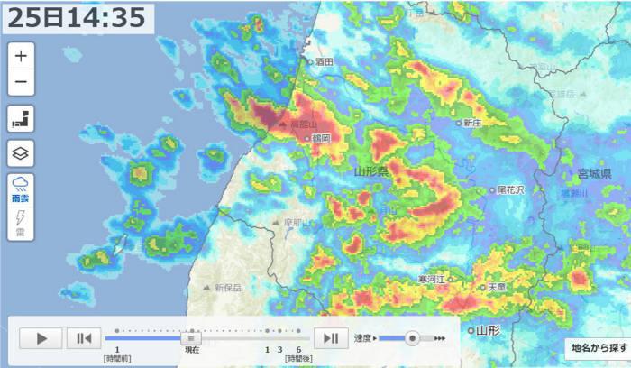 庄内地方の天気がやばいことになっています。今現在 外は大雨と雷が鳴っています。庄内には線状降水帯が発生していて、今後数時間大雨が続きそうです。2024/07/25 14:51