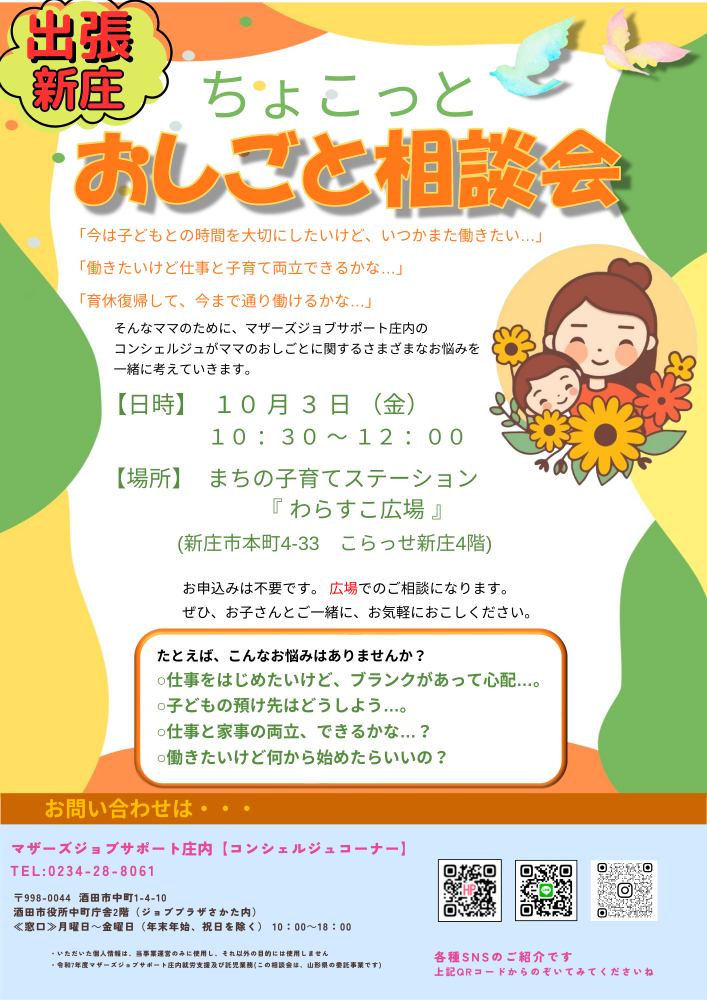 「おしごと相談会」10月開催のお知らせです*.:・.。**.:・.。**.:・.。**.:・.。**10月3日(金)@10:30〜12:00 『ちょこっとお仕事相談会!』そろそろ働こうかな...いつか働こうかな...この働き方で続けていけるかな...そんなママのためにマザーズジョブサポート庄内のマザーズコンシェルジュがママのお仕事に関するさまざまなお悩みを一緒に考えていきます一緒に不安を解消したい方、ご興味のある方、ぜひ、ご参加ください(^^)/お申込みは不要ですぜひ、お子さまと一緒にお気軽に遊びに来てください(^^♪【場所】まちの子育てステーション『わらすこ広場』(新庄市本町4-33こらっせ新庄4階) どうぞ、お気軽にお問い合わせくださいね。◇お問い合わせ◇マザーズジョブサポート庄内TEL:0234-28-8061☆★☆コンシェルジュコーナーでLINEアカウントやっております♪              ☆★☆セミナーのお知らせや、お問い合わせ、お申込みにも対応しています♪ぜひお友達になってください☆https://lin.ee/zBnhdYULINEの場合は「お名前、電話番号、申込み講座、託児の有無」を送信して返信をお待ちください