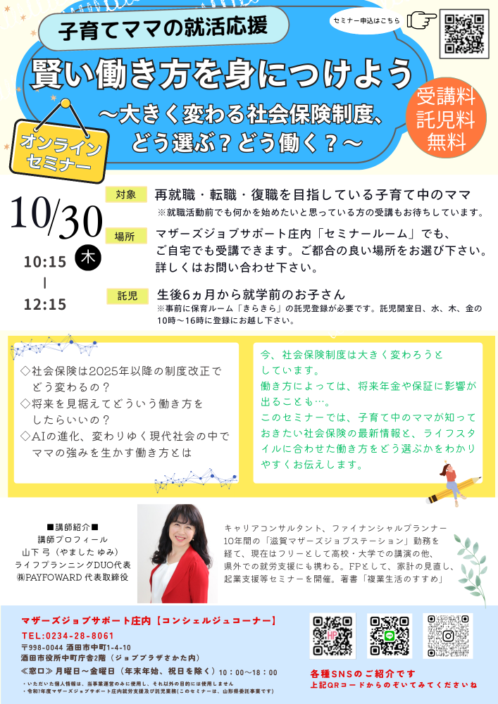 『賢い働き方を身につけよう〜大きく変わる社会保険制度、どう選ぶ?どう働く?〜』     オンラインセミナーマザーズジョブサポート山形との共同開催です!オンラインでの受講となります。 ◇:*:☆:*:◇:*:☆:*:◇:*:☆:*:◇:*:☆:*:◇今社会保険は大きく変わろうとしています。働き方によっては、将来年金や保証に影響が出ることも…このセミナーでは、子育て中のママが知っておきたい社会保険の最新情報と、ライフスタイルに合わせた働き方をどう選ぶかをわかりやすくお伝えします。 ※マザーズジョブサポート山形でのセミナー開催の 様子をzoomで配信します。 セミナールームでもご自宅でも受講可能です!●ご自宅でオンライン受講ご利用の方へ●・インターネット環境が必要になります。 通信料は自己負担です。・パソコン、スマートフォン、 またはタブレットで受講できます。・スマホまたはタブレットをご利用の方は 事前にZoom meetingsを ダウンロードしてください。・セミナー中はカメラをオンにし、 お顔の見える状態で受講して下さい。 また、マイクで会話による現状確認が できる形でご受講をお願いしております。 ☆--- -- -- -- -- -- -- -- -- -- --☆【日時】10月30日(木)10:15〜12:15【講師】キャリアコンサルタント・ファイナンシャルプランナー山下 弓 氏 【会場】マザーズジョブサポート庄内 セミナールーム または ご自宅でのオンライン受講 (zoom使用) 【受講料】 無料 ☆ご自宅にてオンライン受講の方は、  zoom通信料等はご自身負担になります。 【託 児】※事前登録・予約が必要です。 ご利用希望の方はお問合せください。 保育ルーム開室日【水・木・金】の 10:00〜16:00に登録が必要となります。 ※併設の保育ルームで、保育スタッフが お子さんをお預かりします。 ママは安心して受講いただけます。          【駐車場について】お車でお越しの際は、中町庁舎脇にある〈セントラルホテル契約駐車場〉をご利用ください。(ジョブプラザさかたと表示してあります。)※契約駐車場が満車の場合は、酒田市中央地下駐車場をご利用ください。無料駐車券(最大2時間)を発行いたします。 どうぞ、お気軽にお問い合わせくださいね。☆★☆コンシェルジュコーナーでLINEアカウントやっております♪              ☆★☆セミナーのお知らせや、お問い合わせ、お申込みにも対応しています♪ぜひお友達になってください☆https://lin.ee/zBnhdYULINEの場合は「お名前、電話番号、申込み講座、託児の有無」を送信して返信をお待ちください ◇お申込み・お問い合わせ◇マザーズジョブサポート庄内TEL:0234-28-8061メールでのお申込みはコチラマザーズジョブサポート庄内コンシェルジュコーナーからの返信をもって申込受付完了となります