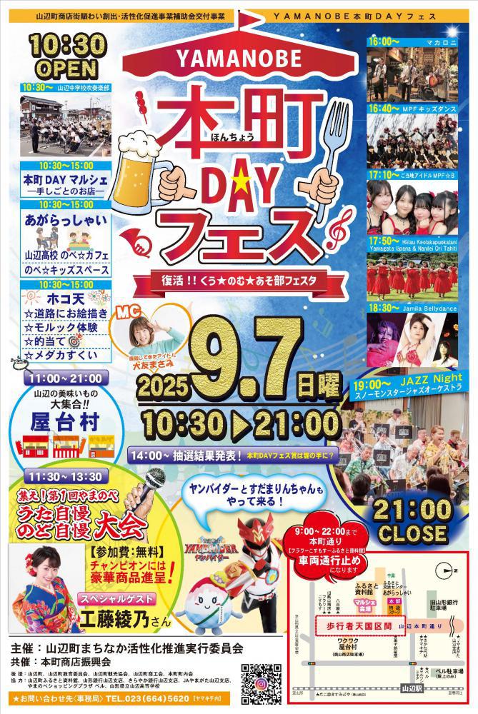 『YAMANOBE本町DAYフェス』〜復活!くう★のむ★あそ部フェスタ〜が開催されます!内容もパワーアップして盛りだくさんです!!【日時】9月7日(日) 10:30〜21:00【会場】山辺町本町通り【通行止め】フラワーこすもす〜ふるさと資料館(9:00〜22:00)【駐車場】 旧山形銀行山辺支店駐車場 ショッピングプラザベル屋上駐車場 JAやまがた山辺支店駐車場※指定以外の近隣駐車場への駐車は絶対におやめください。※駐車場内でのトラブルは主催者側では一切責任を負いません。【その他】詳細はチラシをご覧ください♪【お問合せ先】 Tel 023-664-5620 ヤマキチ内事務局 庄司まで