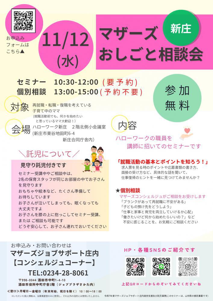 マザーズジョブサポート庄内おしごと相談会 in 新庄を開催します。【開催日】11月12日(水)【開催場所】ハローワーク新庄2階北側小会議室(新庄市東谷地田町6-4 新庄合同庁舎内) 【内容】第1部 10:30〜12:00「就職活動の基本とポイントを知ろう!」(要予約)求人票を見るときのポイントや応募書類の書き方、面接の受け方など具体的な話を聞いて、仕事復帰のヒントを一緒に見つけてみませんか?第2部 13:00〜15:00 個別相談会 (予約不要)・おしごとに関するお悩み・子どもの預け先・仕事と家事、子育てとの両立 など、お気軽にご相談ください。※どなたでもご利用いただけます、 ♪お子さんと一緒に、お気軽にお越しください♪お子さんと同じお部屋でセミナーを受講し、相談することができます。保育スタッフが、ママをサポートいたします。 どうぞ、お気軽にお問い合わせくださいね。☆★☆コンシェルジュコーナーでLINEアカウントやっております♪ ☆★☆セミナーのお知らせや、お問い合わせ、お申込みにも対応しています♪ぜひお友達になってください☆https://lin.ee/zBnhdYULINEの場合は「お名前、電話番号、申込み講座、託児の有無」を送信して返信をお待ちくださいマザーズジョブサポート庄内コンシェルジュコーナーからの返信をもって申込受付完了となります◇お申込み・お問い合わせ◇マザーズジョブサポート庄内TEL:0234-28-8061