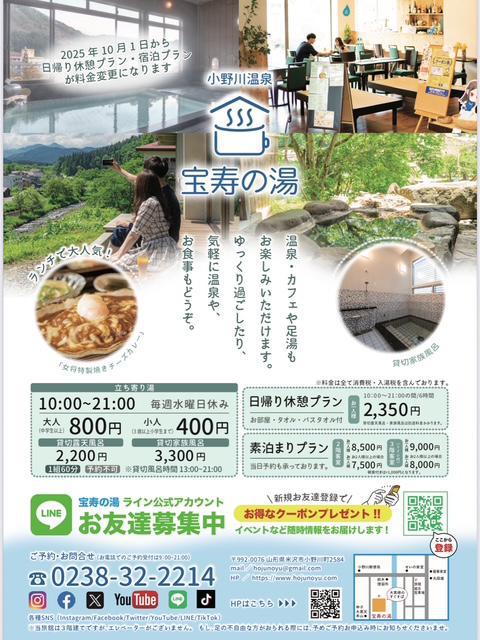 料金改定のお知らせ平素より宝寿の湯をご利用いただき、誠にありがとうございます。このたび、原材料費や運営コストの高騰に伴い、誠に恐縮ではございますが、2025年10月1日より日帰り休憩プラン、宿泊料金を以下の通り、改定させていただくこととなりました。【改定後の料金】??日帰り休憩プラン:2,350円??素泊まり料金: 2階客室 (1部屋1名様の場合) 8,500円、(1部屋2名様以上の場合)7,500円 3階客室 (1部屋1名様の場合) 9,000円、(1部屋2名様以上の場合)8,000円 ※朝食付きは+1,000円となります。引き続き、お客様にご満足いただけるサービスを提供できるよう努めてまいります。何卒ご理解賜りますようお願い申し上げます。