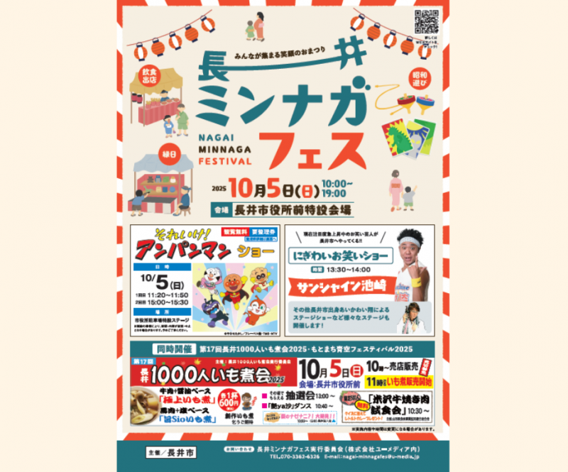 『長井ミンナガフェス』開催日: 2025年10月5日(日) 会 場: 長井市役所前特設会場 地域の魅力を再発見し、世代を超えて楽しめる「長井ミンナガフェス」。今回は「第17回長井1000人いも煮会2025」「もとまち青空フェスティバル2025」との同時開催です! ■それいけ!アンパンマンショー 日時 10月5日(日) 1回目 11:20〜11:50 / 2回目 15:00〜15:30 観覧無料 観覧には整理券が必要です。 会場 市役所駐車場特設ステージ ※諸般の事情により、時間・内容が変更・中止となる場合があります。予めご了承ください。 ■にぎわいお笑いショー現在注目度急上昇中のお笑い芸人が長井市へやってくる!!13:30〜 サンシャイン池崎 お笑いステージ17:00〜 あいかわい翔 お笑いステージ ■昭和レトロ縁日・昭和あそびコーナー子供も大人も楽しい射的や水ヨーヨー釣りなど縁日ブースでみんなで楽しもう!長井のレトロをさがせ!レトロたんけんウォーク時間 10:00〜19:00長井の街中にかくされたレトロアイテムを探すたんけんゲーム。集めた数によって豪華景品が当たるガラポンに挑戦できるよ! ■ミニ新幹線乗車体験時間 10:00〜15:00小さなお子さまから大人まで楽しめる、新幹線体験! ■カラオケ大会採点機能付のカラオケで豪華景品をゲットしよう!歌自慢のみなさんのチャレンジをお待ちしております。賞品 第1位 ながいコイン5万円 ▼△▼△第17回 長井1000人いも煮会2025▼△▼△会場:長井市役所前10:00〜 売店販売スタート!※『いも煮販売開始』は11時頃予定!今回は“米沢牛焼肉試食会”や“抽選会”のほか、“ダンスパフォーマンス”も♪詳しくはコチラ→長井1000人いも煮会2025 ▼△▼△もとまち青空フェスティバル2025▼△▼△会場:本町大通り商店街・らくがき・アート広場・カップラーメン&お菓子積み大会 先着順→13:00から受付開始 《参加料:こども300円・中学生以上500円》・テント市&オープンカフェ・商店街を歩こう 当日参加、仮装も大歓迎詳しくはコチラ→もとまち青空フェスティバル(Instagram) ≪お問い合わせ≫ 長井ミンナガフェス実行委員会≪HP≫ 長井ミンナガフェス公式ホームページ 長井市ホームページ にぎやかなステージパフォーマンスや地元のグルメ、ワークショップを通して、子どもから大人までみんなが笑顔になれる時間をお届けします(*'ω'*)