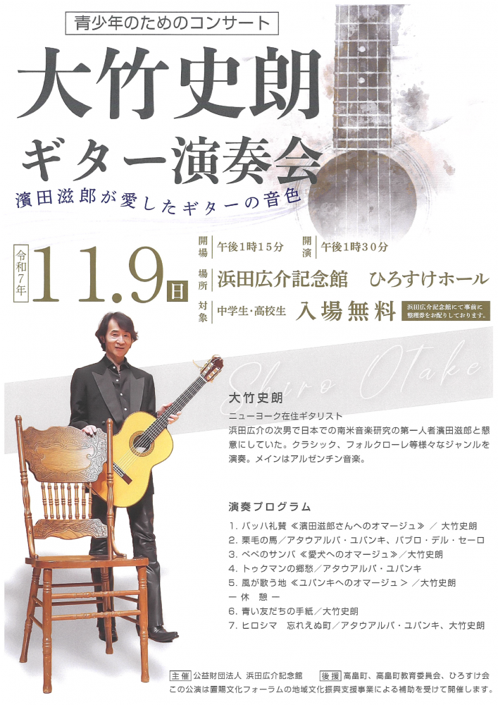 置賜総合支庁、置賜3市5町の文化行政担当部局、各市町の芸術文化協会などで組織する置賜文化フォーラムでは、置賜地域の文化振興と地域活性化を図ることを目的に、置賜地域の住民が主体となった文化事業に対し、補助金を交付しています。今年度採択された「浜田広介記念館」では、大竹史朗ギター演奏会〜濱田滋郎が愛したギターの音色〜を開催します。ニューヨーク在住のギタリスト、大竹史朗氏による演奏会の他、懇意にしていた浜田広介の次男、滋郎とのエピソードを語ります。ぜひ、ご来場ください。<開催日時>令和7年11月9日(日) 開演:13:30(開場:13:15)<場所>浜田広介記念館 ひろすけホール<入場料>無料詳細はチラシをご覧ください。