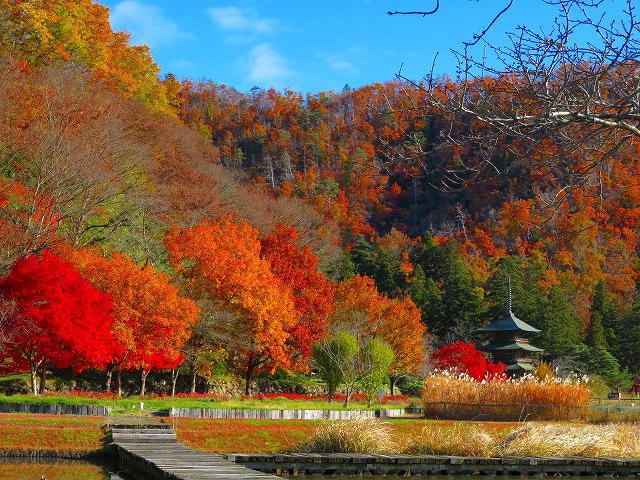 安久津八幡神社と三重塔のある歴史公園周辺の紅葉が見ごろです♪赤や黄色の鮮やかな色が山の表面を彩り綺麗です。いまのうちにぜひどうぞ〜♪