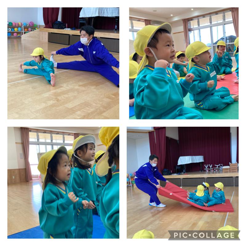 先生の真似をして、楽しく体を動かしています!マットタクシーでは、「わぁーい!」と大喜びの子ども達でした。