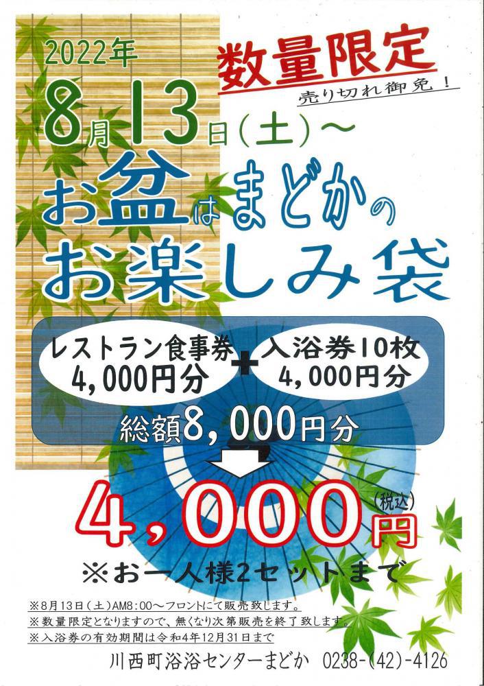 8月13日〜数量限定:売切れごめん!!まどかお楽しみ袋を販売いたします。レストランのお食事券4000円分と入浴券10枚4,000円とプチお菓子付きで8000円以上の所 なんと!!4,000円※お一人様2セットまで※現金のみの販売となります!!ぜひお求めくださいませ!!※お越しになるときはメインのダリヤ園側からの道路は通行できません。※運行ルートご参考にお越し下さいませ。