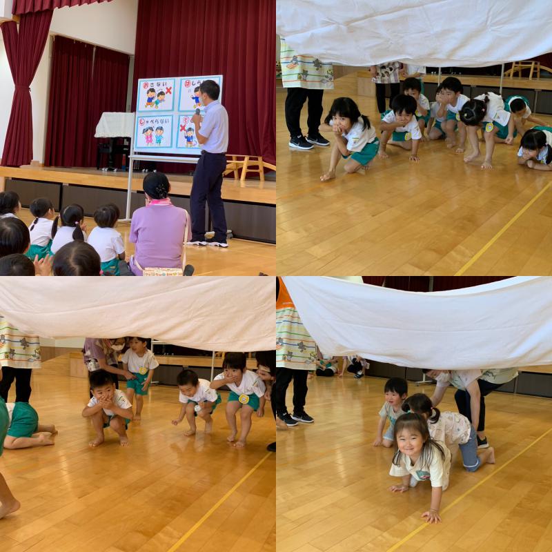 放送を聞いてお遊戯室に避難をし、「おはしも」の約束をみんなで再確認しました。