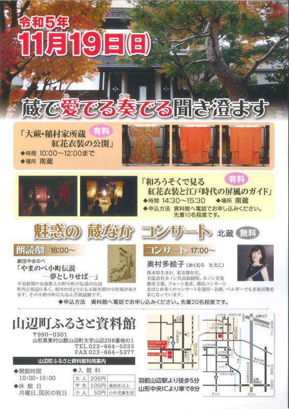11月19日(日)は「紅花衣装の公開と蔵なかコンサート」を開催します。紅花染め着物3点は、「山寺が支えた紅花文化」の構成文化財として日本遺産に認定されており、1年に1度限りの公開となります。夕方4時からは蔵のなかで「朗読劇」と「コンサート」を行います。ぜひお越しください。    紅花衣装公開   ・10:00〜12:00  大蕨・稲村家所蔵紅花衣装の公開   ・14:30〜15:30  和ろうそくで見る紅花衣装と江戸時代の屏風のガイド              ※先着10名程度(申込みが必要です)   蔵のなかコンサート    ・16:00〜 朗読劇  ・17:00〜 コンサート             ※先着20名程度(申込みが必要です)お問い合わせ・申込先:山辺町ふるさと資料館           TEL 023−664−5033           FAX 023−664−5377入館料 :大人200円・学生100円・小人50円