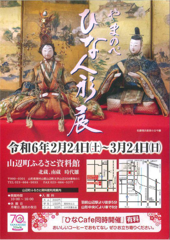 ふるさと資料館にて、2月24(土)〜3月24(日)まで、「やまのべひな人形展」を開催します。山辺町には、江戸時代より最上川舟運や紅花交易で取り寄せたとされる貴重な時代雛がたくさん残されています。それぞれ作られた時代の飾り方で、小道具一つ一つにもこだわりながら展示します。昔ながらの雛との出会いをお楽しみ下さい。 日 時:令和6年2月24日(土)〜3月24日(日)     10:00〜16:00     ※月曜日・祝日は休館日場 所:ふるさと資料館入館料:大人200円、学生(高校生以上)100円、小人(小中児童生徒)50円お問い合わせ先:ふるさと資料館        TEL023−664−5033