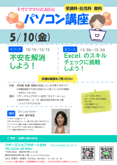 ☆マザーズジョブサポート庄内主催☆毎回大人気!『パソコン講座』のお知らせ ≪Aコース≫  5月10日(金)10:15〜12:15『不安を解消しよう!』「求人票の"パソコンが使える方"ってどの程度?」「仕事では、どのくらいのスキルが求められるの?」「WordとExcelって、どの程度使えると大丈夫?」こんな不安を解消しつつ、効率的な文字入力や便利なショートカットなど、仕事でぐっと差がつくパソコンの基本操作について学び、今後のスキルアップに役立つ情報を提供します。  ≪Bコース≫  5月10日(金)13:30〜15:30『Excelのスキルチェックに挑戦しよう!』Excel、使いこなせていますか?実務で使える内容をギュッとまとめてご紹介します♪基本操作のスキルチェックで自分が理解しているところとそうでないところが明確に?講師の「なるほど〜」な解説を聞き理解をぐっと深めます。♪片方のコースのみ、両方のコース、どちらの受講でも可能です♪【対 象】再就職・転職・復職を目指している子育て中のママ※就職活動前で何かを始めたいママもOK【会 場】マザーズジョブサポート庄内 セミナールーム【料 金】受講料 及び 託児料 無料【託 児】※事前登録・予約が必要です。 保育ルーム開室日【水・木・金】の 10:00〜16:00に登録にお越し下さい。 ※併設の保育ルームで、保育スタッフが お子さんをお預かりします。 ママは安心して受講いただけます。 【駐車場について】お車でお越しの際は、中町庁舎脇にあるセントラルホテル契約駐車場をご利用ください。(ジョブプラザさかたと表示してあります。)※契約駐車場が満車の場合は、酒田市中央地下駐車場をご利用ください。無料駐車券(最大2時間)を発行いたします。お帰りの際に、コンシェルジュ窓口へお声がけください。どうぞ、お気軽にお問い合わせくださいね。◇お申込み・お問い合わせ◇マザーズジョブサポート庄内TEL:0234-28-8061メールでのお申込みはコチラ