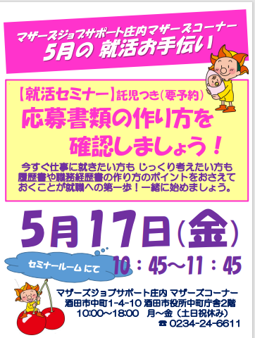 5月 マザーズジョブサポート庄内  マザーズハローワークコーナー ☆☆☆☆☆☆☆☆☆☆☆☆☆☆☆☆☆☆☆☆求職支援セミナー 『応募書類の作り方 確認しましょう!』 を行います!  このセミナーは就職への第一歩! 履歴書・職務経歴書のポイント をお伝えします。☆☆☆☆☆☆☆☆☆☆☆☆☆☆☆☆☆☆☆☆ ______________________模擬面接  ご希望に合わせ随時お受けいたします。 面接が久しぶりな方や苦手意識がある方に 特におすすめ、よくある質問をもとに練習し 具体的なアドバイスを致します。______________________  ハローワークマザーズコーナーでは 定期的にセミナーを開催します。 奮ってご参加下さい。 受講後も疑問点など、 窓口にてご相談が受けられます。  【日 時】 5月17日(金) 10時45分〜11時45分【対 象】 お仕事探し中の子育てママさん【会 場】 マザーズジョブサポート庄内  セミナールーム【料 金】 受講料 及び 託児料 無料 ※お申込みが必要です。【託 児】 ※事前登録・予約が必要です。 ※併設の保育ルームで、保育スタッフが お子さんをお預かりします。 ママは安心して受講いただけます。                【駐車場について】 お車でお越しの際は、中町庁舎脇にある   セントラルホテル契約駐車場をご利用ください。(ジョブプラザさかたと表示してあります。) ※契約駐車場が満車の場合は、 酒田市中央地下駐車場をご利用ください。 ご利用の方は、無料駐車券を(最大2時間) を発行いたします。 お帰りの際に、マザーズコーナー窓口へお声がけください。  どうぞ、お気軽にお問い合わせくださいね。  ◇お申込み・お問い合わせ◇ マザーズジョブサポート庄内 TEL:0234-24-6611(ハローワークマザーズコーナー) TEL:0234-28-8061(コンシェルジュコーナー)