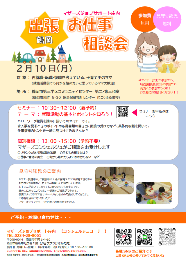 マザーズジョブサポート庄内おしごと相談会 in 鶴岡を開催します。【開催日】2月10日(月)【開催場所】鶴岡市第三学区コミュニティセンター 第一・第二和室(鶴岡市泉町5-30   総合福祉センターにこふる隣接) 【内容】10:30〜12:00 セミナー テーマ「就職活動の基本とポイントを知ろう!」ハローワーク職員を招いてのセミナーです。求人票を見るときのポイントや書類の書き方、面接の受け方など具体的な話を聞いて、仕事復帰のヒントを一緒に見つけてみませんか?※お申込みが必要です。13:00〜15:00 個別相談会・おしごとに関するお悩み・子育てに関すること・仕事と家事、子育てとの両立      など、お気軽にご相談ください。※どなたでもご利用いただけます、お申込みは不要です。  ♪お子さんと一緒に、お気軽にお越しください♪お子さんと同じお部屋でセミナーを受講し、相談することができます。保育スタッフが、ママをサポートいたします。  ◇お申込み・お問合せ◇マザーズジョブサポート庄内TEL:0234-28-8061メールでのお申込みはコチラ