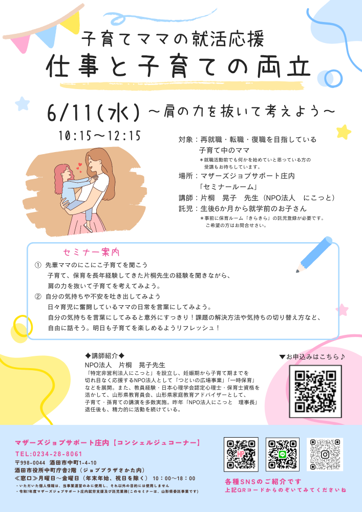 ☆マザーズジョブサポート庄内主催☆〜子育てママの就活応援〜「仕事と子育ての両立」のお知らせです。 子育て、保育に長年携わってきた片桐先生の経験を聞きながらご自身の子育てについて考えてみましょう(^^♪課題の解決方法や気持ちの切り替え方などを自由に話して不安な気持ちをぜひ吐き出してください☆肩の力を抜いて明日も子育てを楽しめるようリフレッシュ(^_-)-☆ 【日 時】6月11日(水)10時15分〜12時15分 【対 象】再就職・転職・復職を目指している子育て中のママ※就職活動前で何かを始めたい方でもOK【会 場】マザーズジョブサポート庄内 セミナールーム【料 金】受講料 及び 託児料 無料【託 児】※事前登録・予約が必要です。ご利用希望の方はお問合せください。保育ルーム開室日【水・木・金】の10:00〜16:00に登録が必要となります。 ※併設の保育ルームで、保育スタッフが お子さんをお預かりします。 ママは安心して受講いただけます。          【駐車場について】お車でお越しの際は、中町庁舎脇にある〈セントラルホテル契約駐車場〉をご利用ください。(ジョブプラザさかたと表示してあります。)※契約駐車場が満車の場合は、酒田市中央地下駐車場をご利用ください。無料駐車券(最大2時間)を発行いたします。 どうぞ、お気軽にお問い合わせくださいね。☆★☆コンシェルジュコーナーでLINEアカウントやっております♪              ☆★☆セミナーのお知らせや、お問い合わせ、お申込みにも対応しています♪ぜひお友達になってください☆https://lin.ee/zBnhdYULINEの場合は「お名前、電話番号、申込み講座、託児の有無」を送信して返信をお待ちください ◇お申込み・お問い合わせ◇マザーズジョブサポート庄内TEL:0234-28-8061メールでのお申込みはコチラマザーズジョブサポート庄内コンシェルジュコーナーからの返信をもって申込受付完了となります