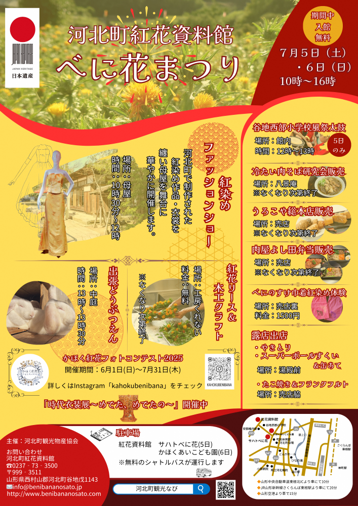 紅花資料館べに花まつり 〜一面に広がる黄金の紅花に囲まれて〜【日 時】2025年 7月5日(土)・6日(日) 10時〜16時【会 場】河北町紅花資料館【入場料】無料べに花まつりでは、紅染め衣裳のファッションショーを初開催!ほかにも地元の味を楽しめる露天の出店や、親子で楽しめるワークショップ、自然の恵みを感じる木工クラフト、紅花リース作り体験もできます!河北町児童動物園からは可愛らしい動物たちもやってきますよ♪●紅染めファッションショー 10:30〜11:00●出張どうぶつえん 13:00〜13:30●谷地西部小学校風祭太鼓 12:00〜13:00●紅花リース&木工クラフト ※なくなり次第終了●べにのすけ巾着 紅染め体験 ※参加料 1500円●冷たい肉そば研究会発売 ※なくなり次第終了●うろこや総本店販売 ※なくなり次第終了●肉屋よし田弁当販売 ※なくなり次第終了●露店 焼き鳥・たこ焼き・フランクフルト スーパーボールすくい&缶あて●紅花資料館企画展「時代衣装展」も開催中