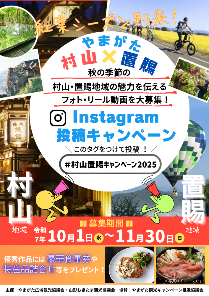 ■募集テーマ 秋の村山地域・置賜地域の魅力が伝わる写真・リール動画 季節の風景、自然、街並み、観光地、食べ物、アクティビティ、イベント等、ジャンルは問いません≪村山地域≫ 山形市、寒河江市、上山市、村山市、天童市、東根市、尾花沢市、山辺町、中山町、河北町、西川町、朝日町、大江町、大石田町)≪置賜地域≫ 米沢市、長井市、南陽市、高畠町、川西町、小国町、白鷹町、飯豊町 ■応募期間2025年10月1日(水)〜2025年11月30日(日) ■応募方法@次のInstagramアカウントの両方をフォロー@yamagata_murayama_kouikikanko (やまがた広域観光協議会公式インスタグラム)@okitamakanko (山形おきたま観光協議会公式インスタグラム)A次の両方を行い、撮影地や撮影内容をキャプション内で明記し、写真・リール動画を投稿してください・下記ハッシュタグをつける #村山置賜キャンペーン2025・下記アカウントをタグ付け、またはキャプション内に記載する @yamagata_murayama_kouikikanko ■賞品 〇最優秀賞(計2点) 食事券(1万円相当) 〇優秀賞 (計8点) 村山・置賜地域の特産品(5,000円相当) ■応募規約 応募規約
