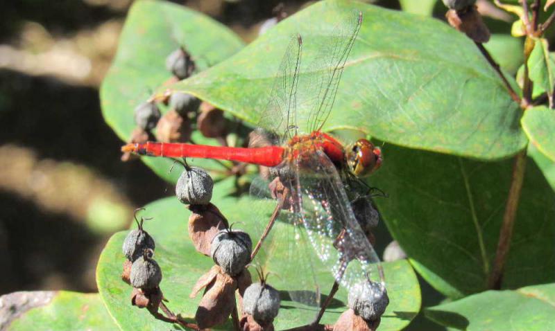 ●この頃あまり見られなくなった「赤トンボ」が庭を訪問してくれました 尻尾が赤くないトンボはよく飛んでいますが本当に久しぶりに赤トンボをみることができました ♪ 夕焼け、小焼けの あかとんぼ 負われてみたのは いつの日か♪ 大正10年に生まれた童謡「赤とんぼ」はあまりにも有名でどこか寂しさを漂わせる郷愁をさそう歌で「赤トンボ」をみると思い出します